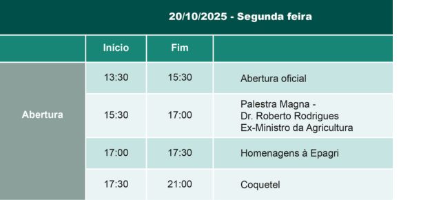 A abertura oficial está marcada para às 13:30h do dia 20, com a presença do governador e outras autoridades. Em seguida acontece a palestra magna, proferida por Roberto Rodrigues, ex-ministro da agricultura.