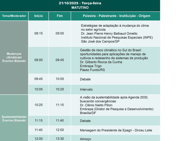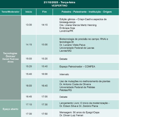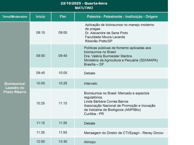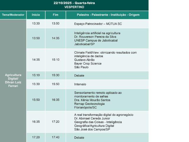 A programação (confira abaixo) segue debatendo seis temas principais: mudanças climáticas, sustentabilidade, tecnologias ômicas, bioinsumos, agricultura digital e inovação aberta.